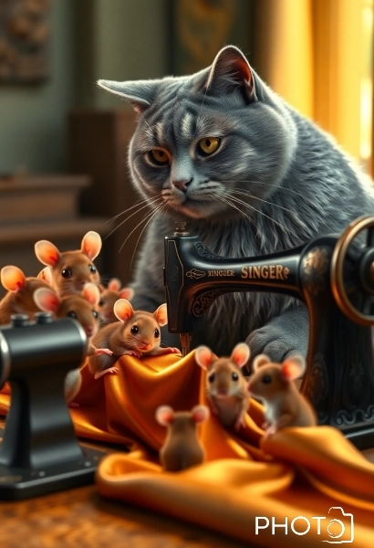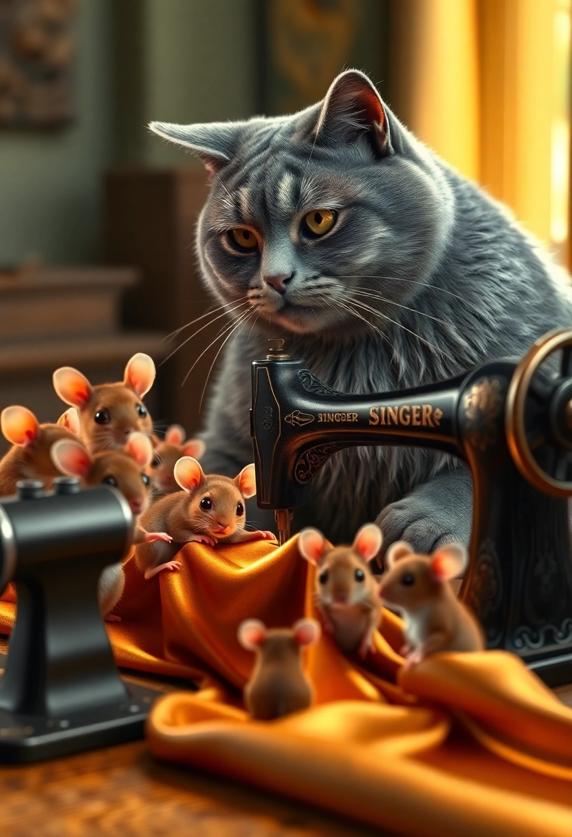 A fat gray cat supervises a group of mice working on an antique Singer sewing machine, stitching shiny flowing fabric. — ultra-realistic, photo-quality, cinematic lighting, high resolution, soft natural shadows, vivid colors, depth of field, 1:1 aspect ratio.