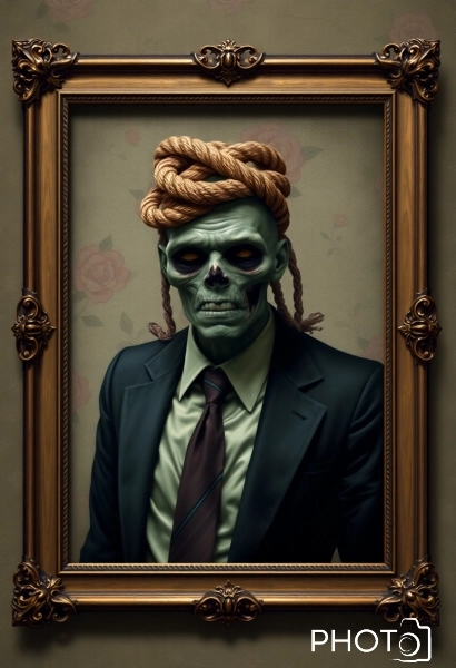 A zombie in a frame wearing a suit, but his head is a slightly thick rope made of several knots, with a vaguely visible face, realistic, with a floral background.