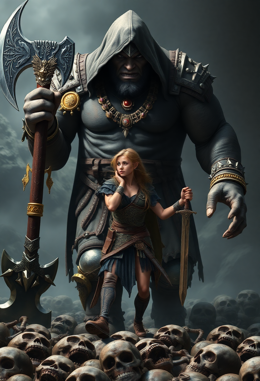Ultra realistic looking DND character, ), hooded giant ogre, holding a giant cursed axe and walking menacing, walking over crushed skeletons, golden ornamented bracelets, jeweled belt, and necklaces. Facing him, stands a tiny barefoot female warrior with full armor, arms extended to the sides, holding a sword and a dagger, standing confidently, dramatic scene, cinematic