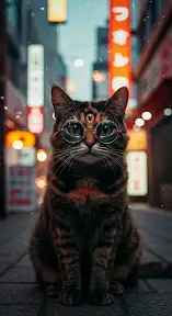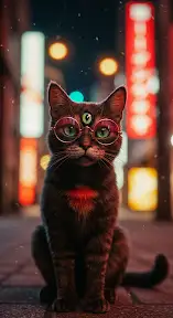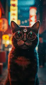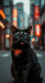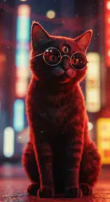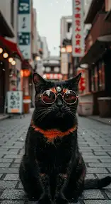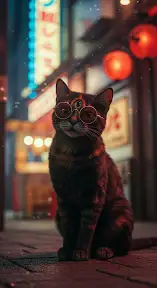 A striking black and red cat perched on a bustling Tokyo street, sporting round-framed third-eye sunglasses that gleam with enigma. Bathed in cinematic and volumetric lighting, this 8K portrait captures every detail with breathtaking clarity, blending urban vibes with a mystical aura.