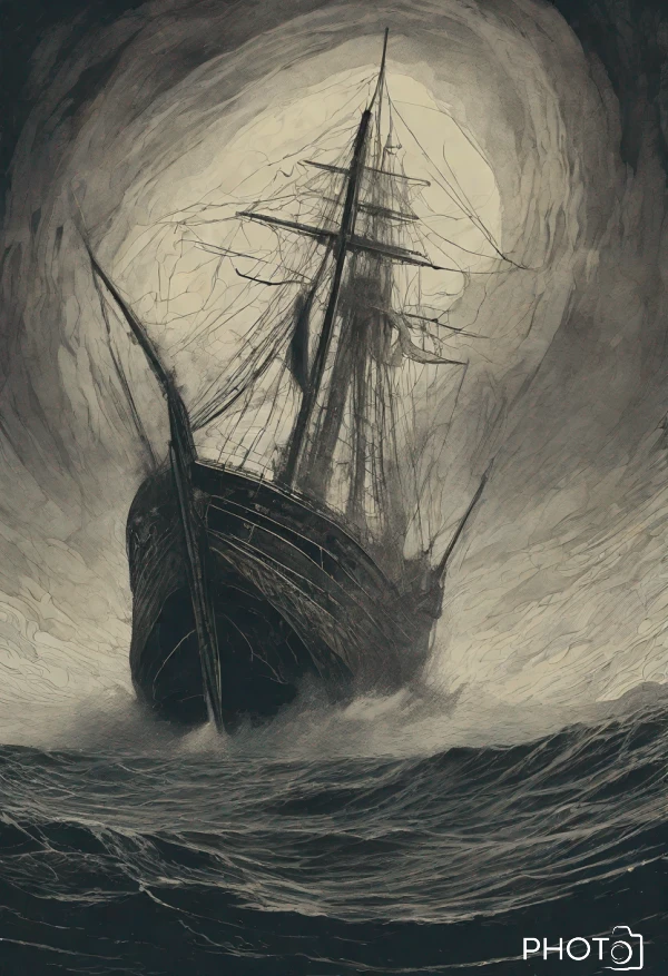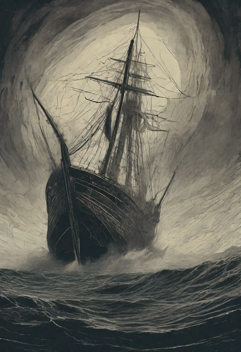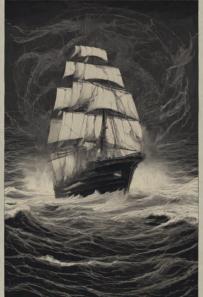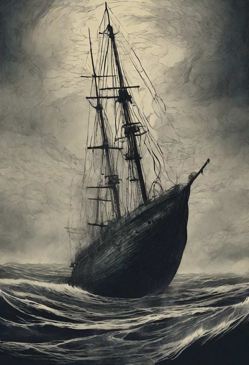 VintageSketch style, YFG-Zaat, Dark digital art of a sailboat in heavy sea, surreal and abstract, Kraken tentacles coming out of water, attacking ship, eerie atmosphere, thick fogBauhaus-Style Poster, by Antony Gormley, (tilted horizon, Terragen but extremely beautiful:1.4), (intricate details, masterpiece, best quality:1.4), Pencil Sketch Drawing, black and white drawing, pencil sketch, graphite drawing, looking at viewer. simple geometric shapes, clean lines, primary colors, Bauhaus-Style Poster.