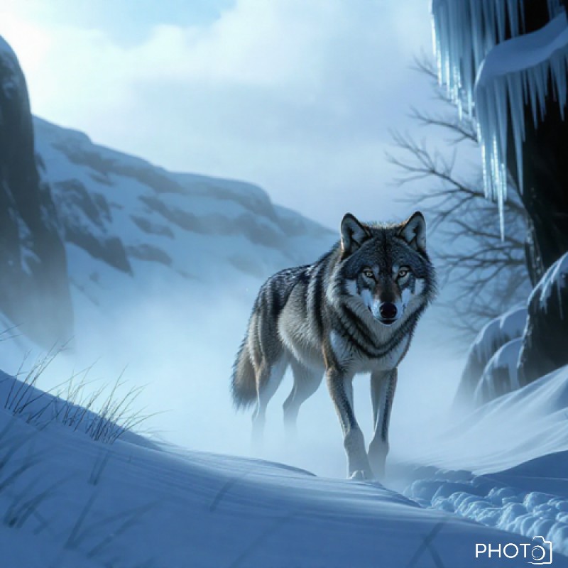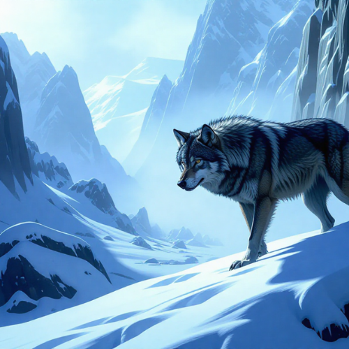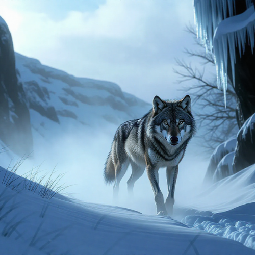 A powerful dire wolf roams the icy, rugged landscape of the Ice Age, its fur dusted with snow as it navigates a world of glaciers and ancient flora.