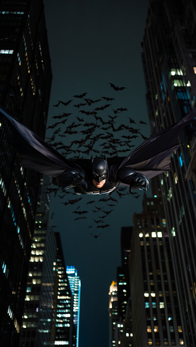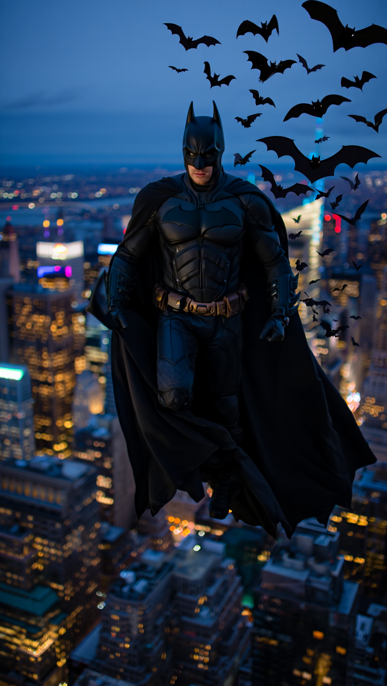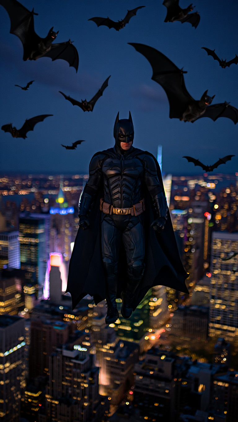 <p>A lone figure in full Batman armor soars above New York City, cape sweeping through the sky as bats streak past neon-lit towers. The night is alive — and justice flies with it.</p>