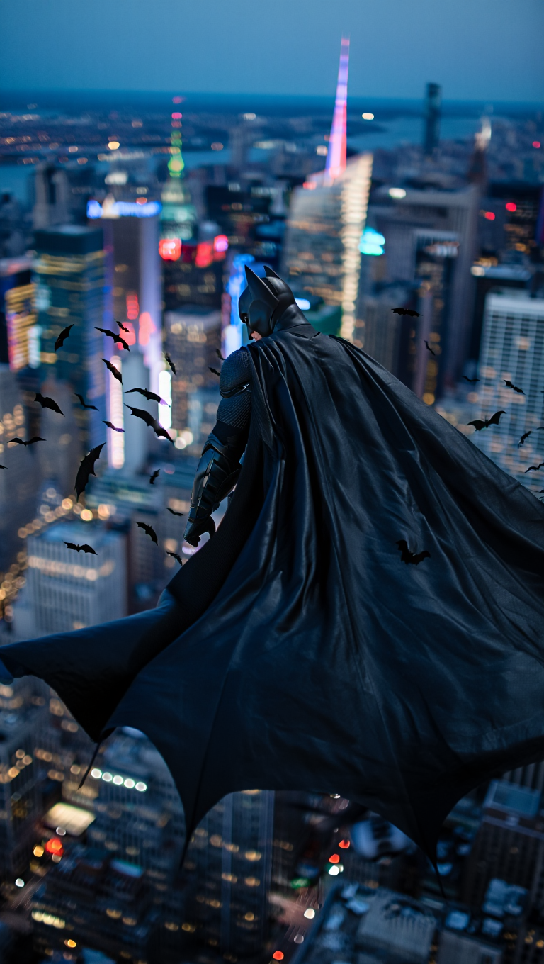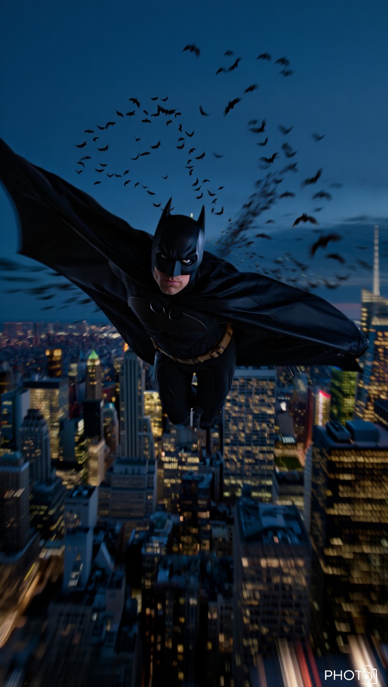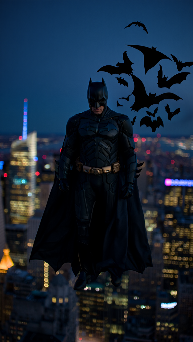 <p>A lone figure in full Batman armor soars above New York City, cape sweeping through the sky as bats streak past neon-lit towers. The night is alive — and justice flies with it.</p>
