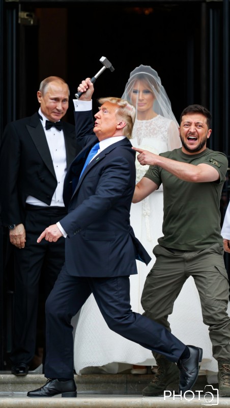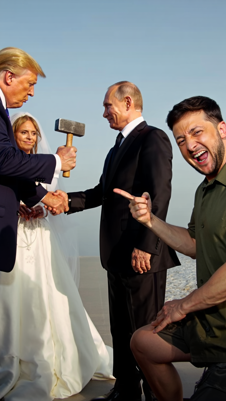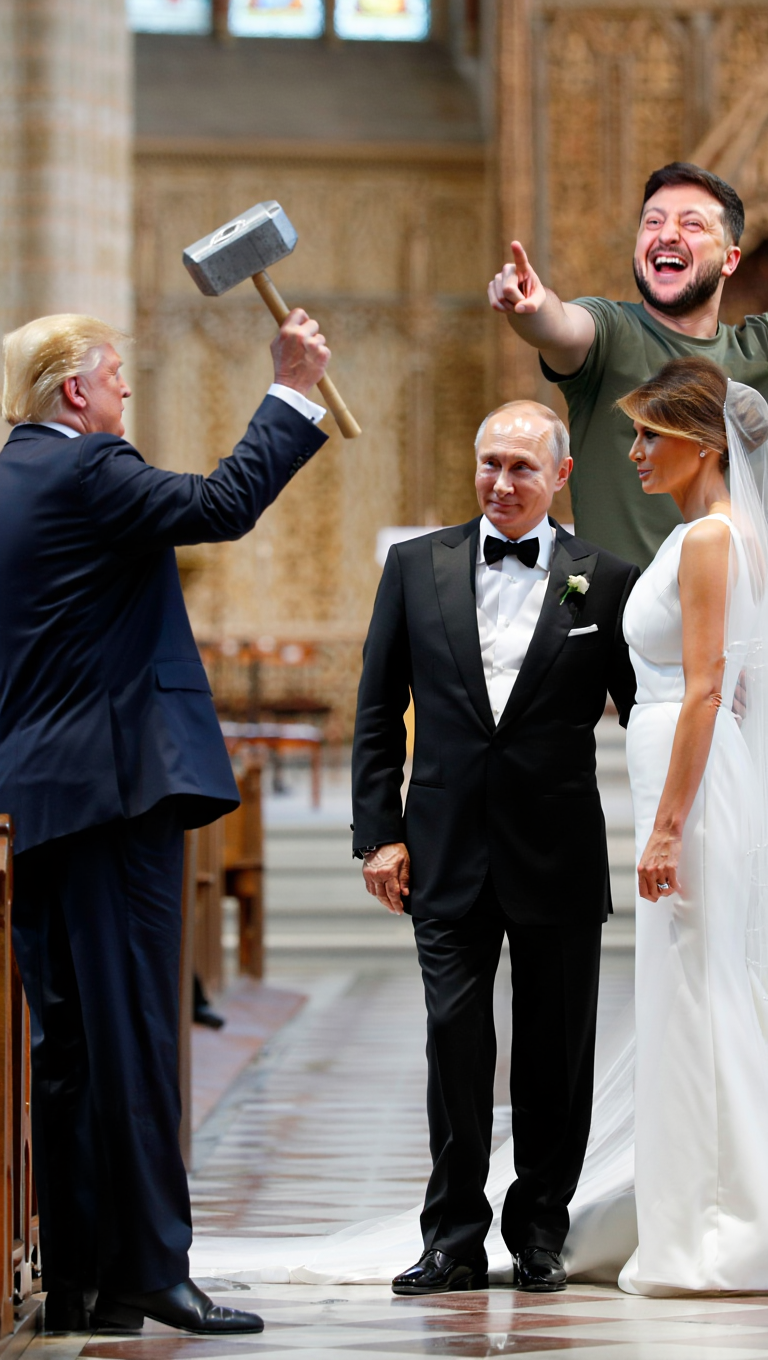 A cinematic wedding scene turns surreal as Putin and Melania Trump stand at the altar, Donald Trump charges in with a hammer, and Zelensky points and laughs in sharp, film-style focus.