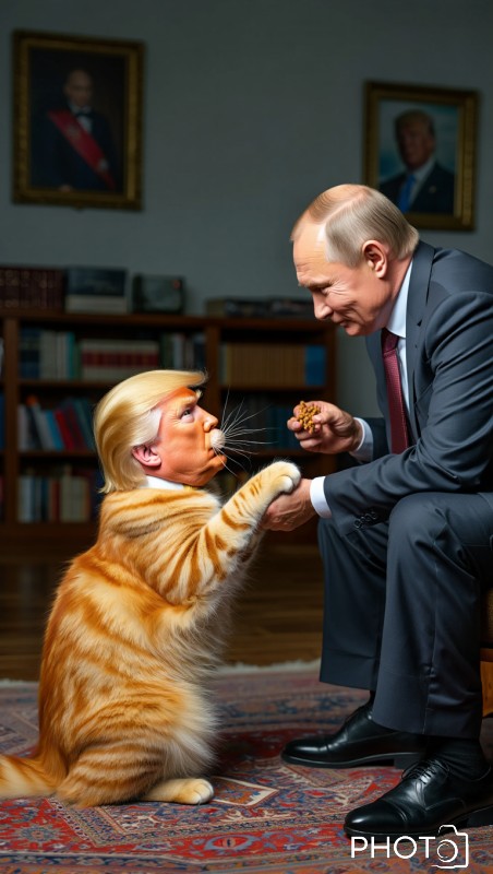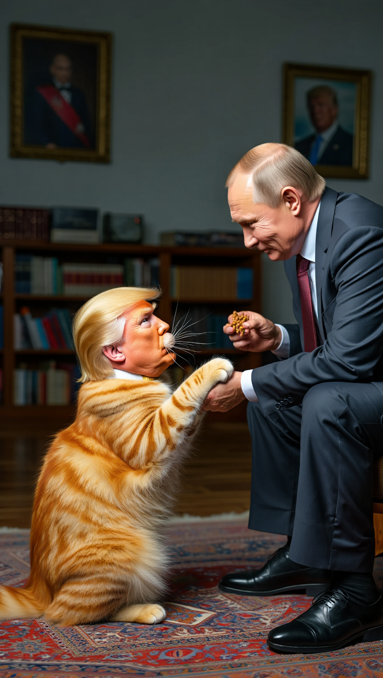 A surreal photorealistic moment where Putin, in formal black attire, offers treats to a ginger cat with Donald Trump’s human head, set in a bright minimalist room with natural daylight.