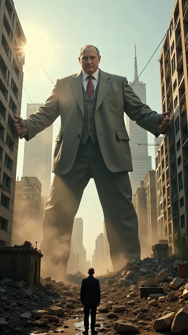 ultra realistic, 8k resolution, cinematic lighting, highly detailed, high angle view, looking down at the scene, modern cityscape with skyscrapers, some buildings partially collapsed, dust and debris in the air, giant anthropomorphic Vladimir putin, cute but powerful, realistic Vladimir putin, expressive face, standing upright like a human, using hands to crush and tear apart buildings, massive scale, sunlight filtering through dust clouds, cinematic destruction scene, chaotic atmosphere, dramatic perspective, city in ruins beneath its feet