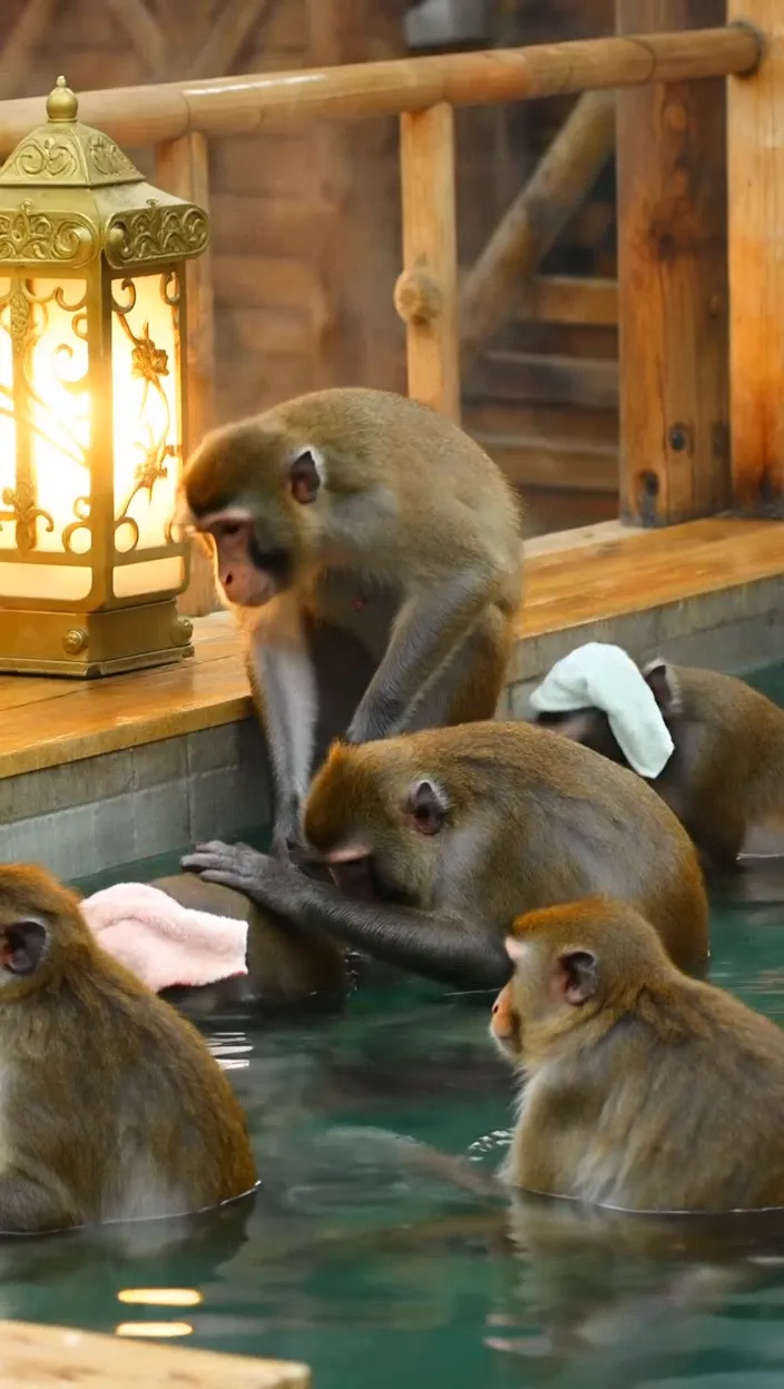 A group of monkeys relaxing in a traditional Japanese onsen, indoor wooden bathhouse, steam rising from the warm water, some monkeys wearing small towels on their heads, cozy golden lighting, cinematic composition, ultra-realistic photography, 9:16 aspect ratio, detailed fur texture, warm and inviting atmosphere, whimsical and heartwarming scene, Japanese commercial photography style, soft cinematic lighting, shallow depth of field