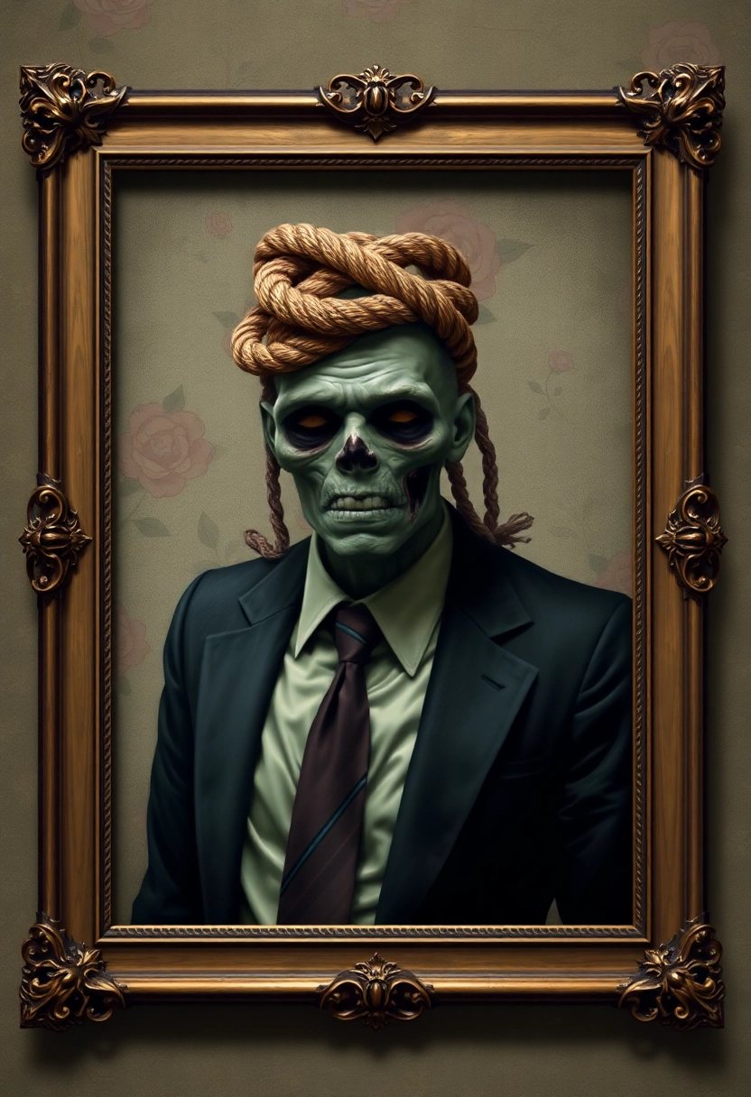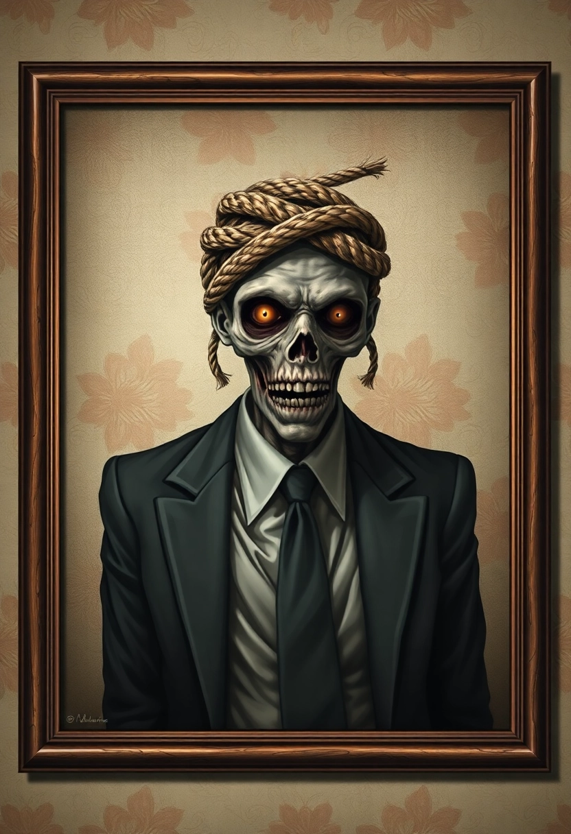 A zombie in a frame wearing a suit, but his head is a slightly thick rope made of several knots, with a vaguely visible face, realistic, with a floral background.