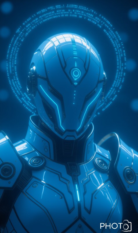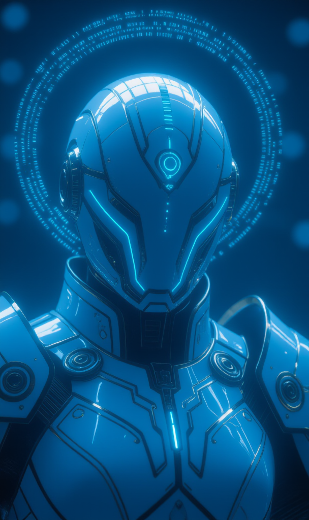A majestic portrait of a futuristic holy warrior—a fusion of knight and machine. Instead of dark, occult vibes, this character exudes regal power and technological divinity. The image features intricate white armor with gold filigree and a halo made of holographic rings. The lighting is bright and ethereal, contrasting with the previous dark cyberpunk tone.