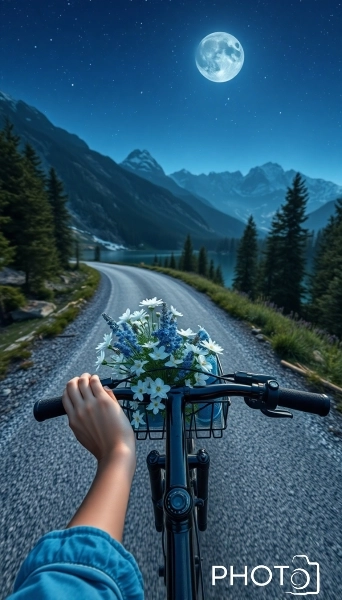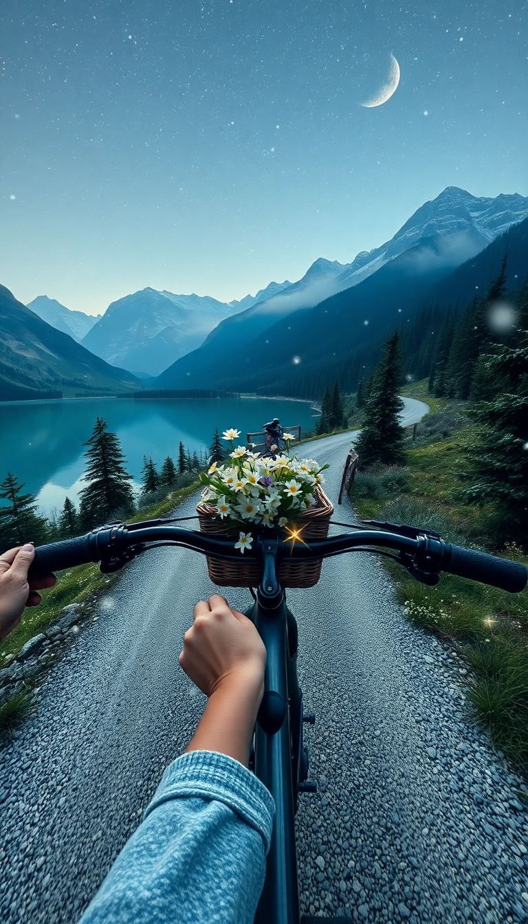 breathtakingly beautiful scene from a first-person perspective the girl rides a bicycle with her hands so tightly gripped on the handlebars that only the handlebars can be seen, and the basket is filled with glowing moonflowers, silver edelweiss and deep blue gentian, colourful against the night sky. The bikes travelled along a winding gravel road beside a crystal-clear alpine lake, its still waters reflecting the constellations and crescent moons twinkling in the starry sky. Black pine forests loomed on either side, mountain peaks were jagged and hazy, and snowflakes gently drifted down from