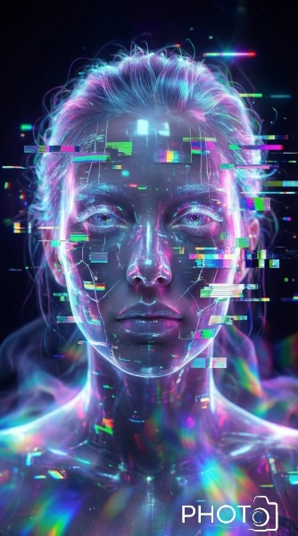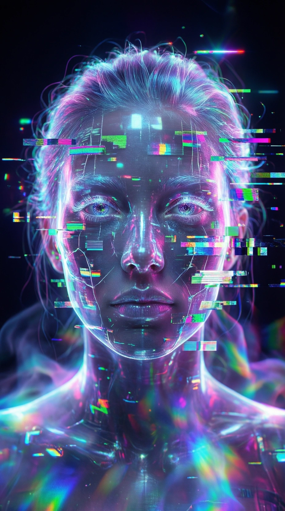 ethereal glitchcore avatar, ghostly neon lights, transparent digital face, colorful broken static, futuristic spectral energy, vibrant holographic mist