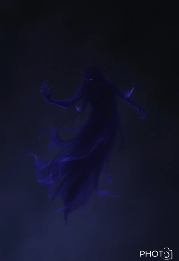 A dark, ethereal lich spirit floats in a haunting void, its form barely visible, flickering with deep violet and midnight blue hues. Its ghostly figure, shadowy and graceful, exudes an eerie, ancient energy. Wisps of darkness swirl around the spirit, shimmering with faint traces of arcane magic.